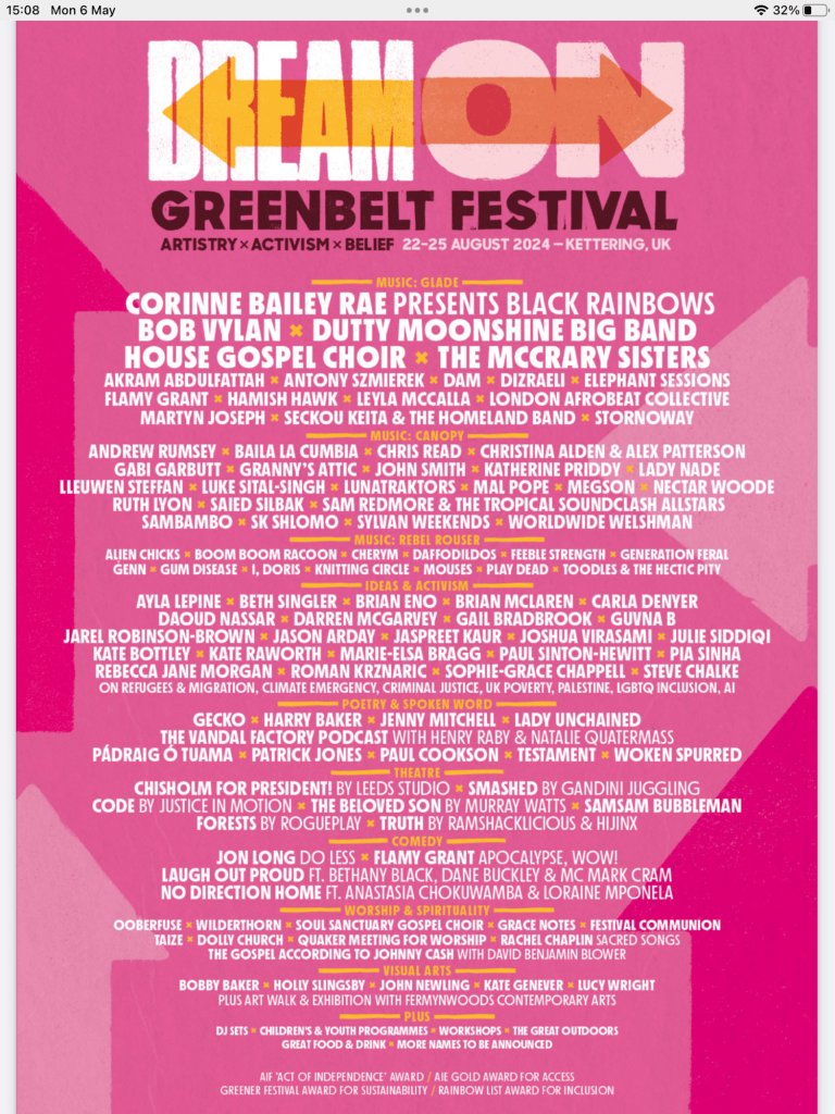 Had a lunch at church today, ended up sharing a table with folks discussing the greenbelt line up plus folks who never heard of the festival. “It’s a Christian festival but the sort that would book bob vylan as headliner ” seemed not bad intro , vylan, corrine Bailey rae and flamy grant felt like a fair introduction. Go one you’ve got 2 sentences max and can drop up to 5 names ; how do you describe the festival?